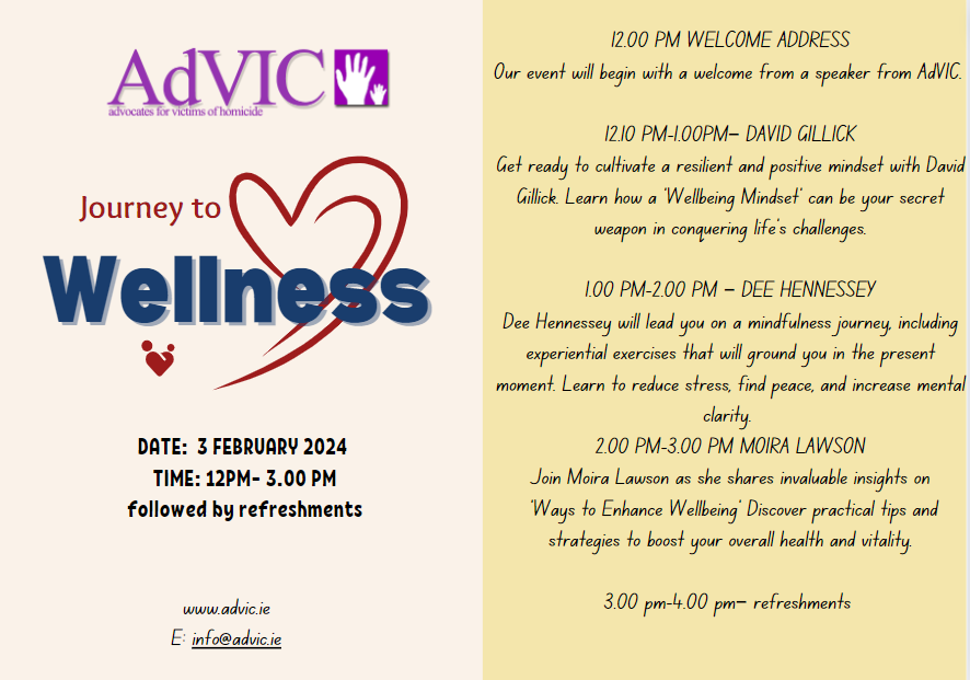 AdVIC invites to a special wellness event for adults and children on February 3rd (Saturday) at Teachers Club, Dublin 1, from 12-3 pm. Details are on the poster.
